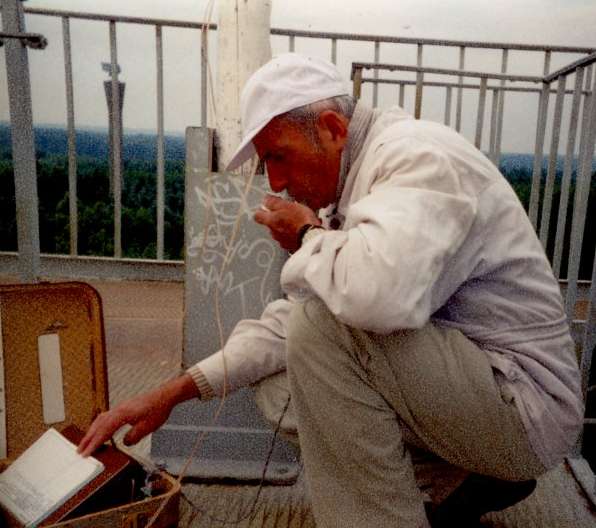 Insel Bornholm, Sonntag, 27.Juni 1999, Berg Rytterknaegten 162 Meter hoch plus 25 Meter Turmhoehe (=187m ueber NN) Aus dem aufgeklappten Koffer schaut die schraeg aufgestellte 144-MHz-SSB-Eigenbau-Station hervor. Antenne: 8 Elemente (Gruppenantenne)